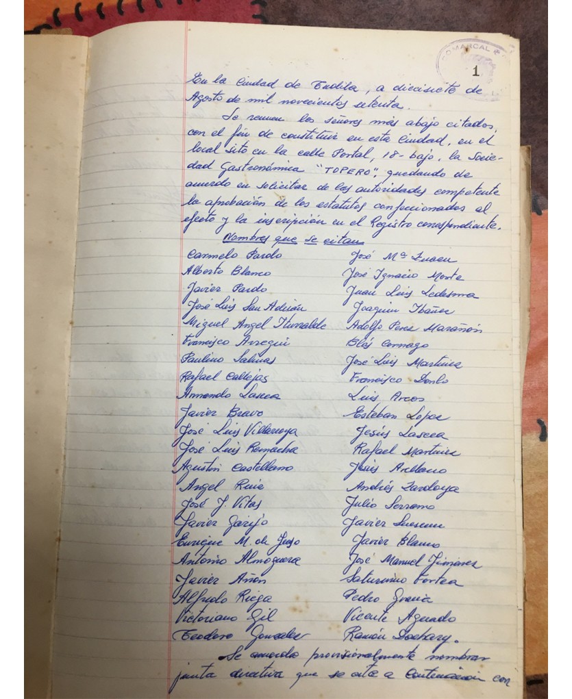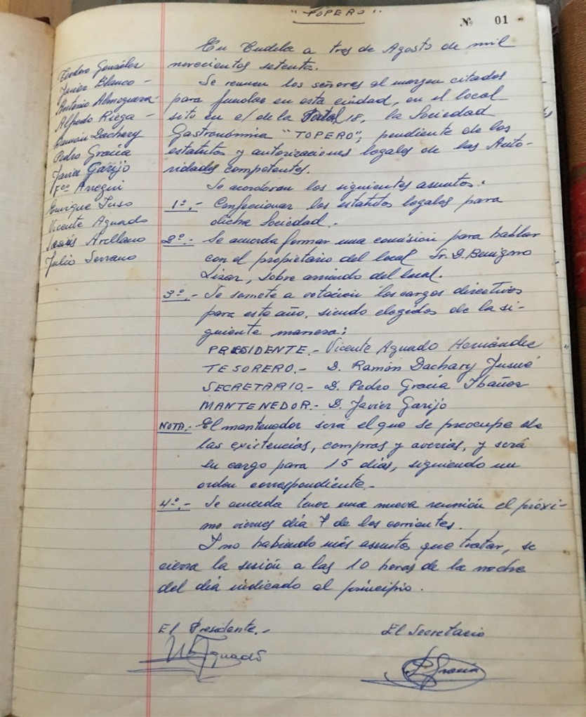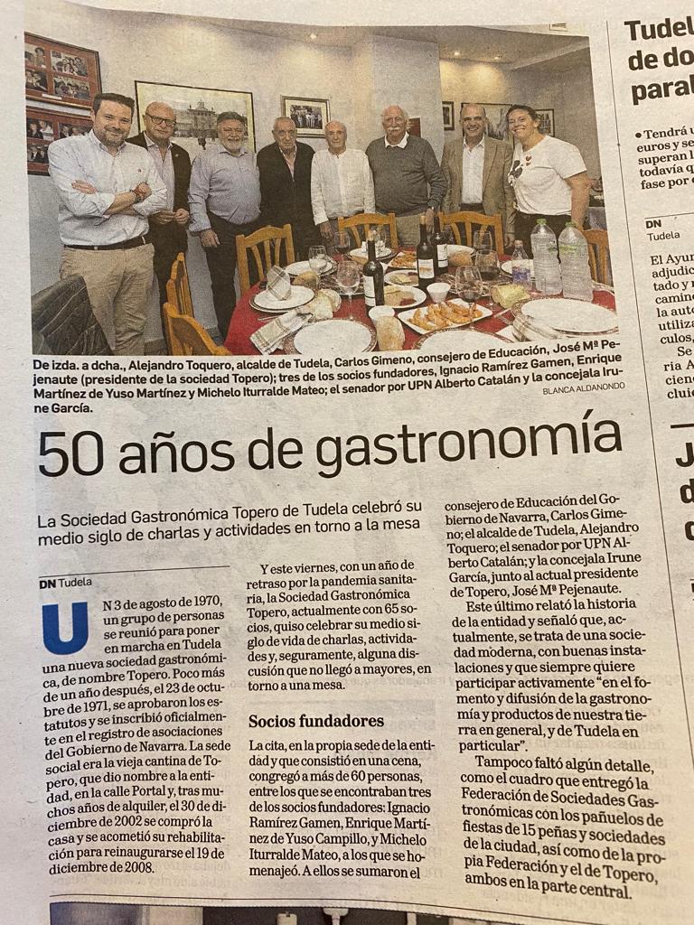 La Sociedad Gastronómica Topero, fundada en 1971 en Tudela (Navarra), nació del deseo de un grupo de amigos por preservar la cocina local, compartir mesa y mantener vivo el espíritu de convivencia que siempre ha caracterizado a nuestra ciudad. Con el paso del tiempo, aquella pequeña iniciativa se ha convertido en una comunidad sólida formada hoy por 65 socios, que reúnen entre todos décadas de experiencia culinaria, compañerismo y tradición.